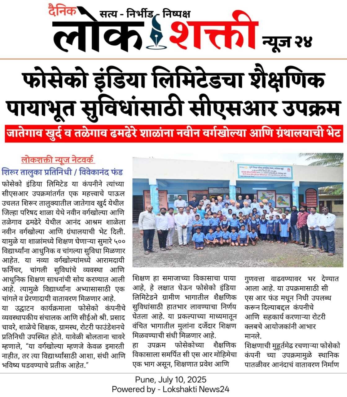In a significant stride towards fostering quality education and community development, Foseco India Limited has inaugurated a set of new classrooms at Zilla Parishad School, Jategaon Khurd Village and Anand Ashram School, Talegaon Dhamdhere as part of its Corporate Social Responsibility (CSR) initiative. This project highlights the organization’s commitment to contributing positively to society by enhancing educational infrastructure and creating an environment conducive to learning.